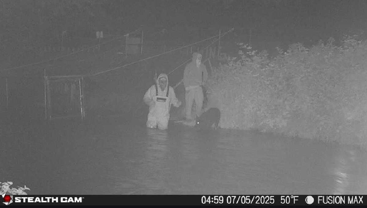 Then on July 5 this year, at approximately 5 a.m., two masked individuals, who match the description and build of the two from last year, were captured on a trail camera approaching the outflow fish trap wearing masks and baggy clothing, and were again accompanied by a black German Shepherd.